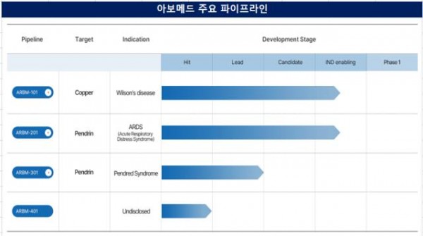 현재 주력하는 신약 파이프라인은 윌슨병 치료제 후보물질 'ARBM-101'이다. 윌슨병은 유전자 이상으로 체내 축적된 구리가 배출되지 않는 희귀질환이다. 아직 근본적인 치료제가 없어 계열 내 최초(First-in-Class) 약물로 개발 중이다. 현재 다국가 임상 1상 진입을 앞뒀다. 작년 국가신약개발사업단(KDDF) 연구 지원과제로 선정돼 관심을 끈 물질이기도 하다.